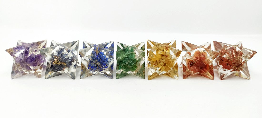 These small merkaba stars are made with 7Chakra orgone crystal, which is believed to have healing properties and promote positive energy flow. The merkaba shape is said to represent the balance between the masculine and feminine energies, and is often used in meditation and spiritual practices.